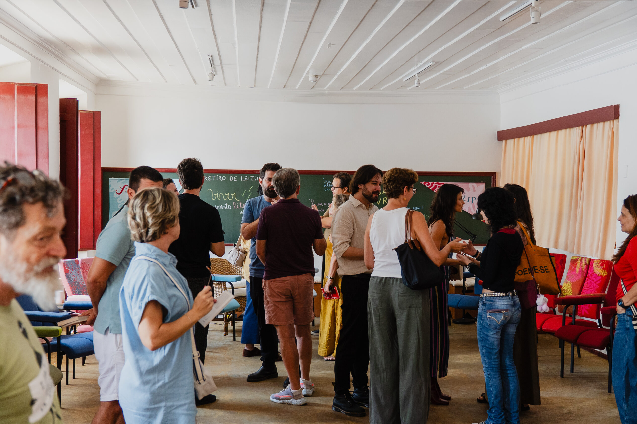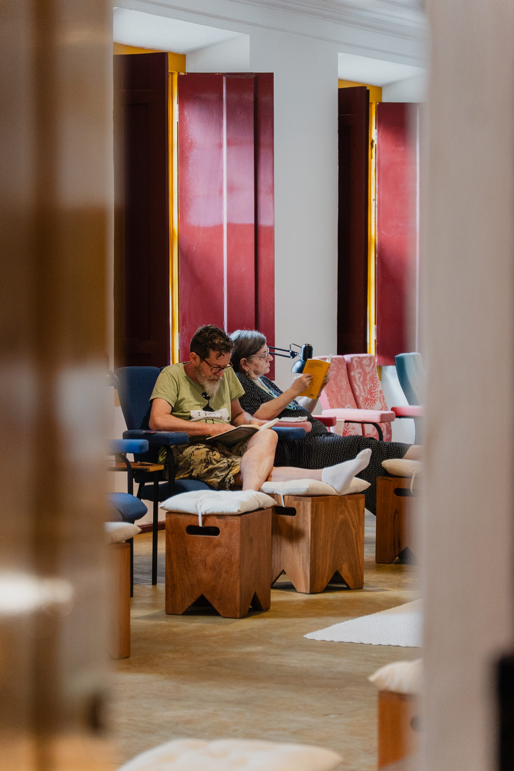 Na Pousada do Ouro, a sala transformada em espaço coletivo de leitura foi montada com o mobiliário utilizado no palco do Auditório da Matriz durante os dias da Festa. Todos os presentes puderam se sentar para ler nas mesmas poltronas que os autores que vêm a Paraty celebrar a literatura todos os anos ocuparam no palco.